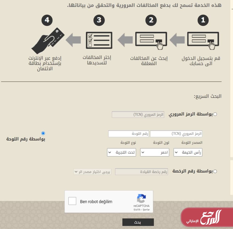 يمكن دفع المخالفات المرورية في إمارة الشارقة برقم الرخصة من خلال اتباع الخطوات التالية: [1]